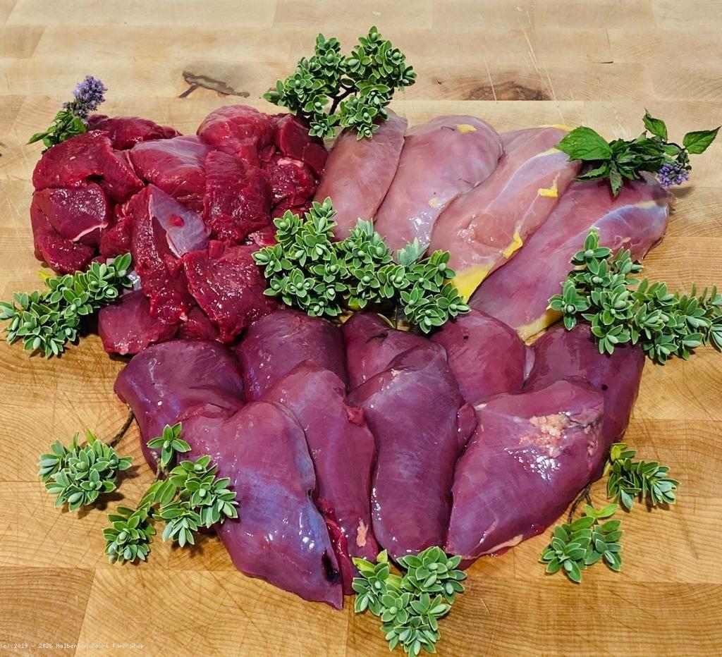 Whole Pheasant, pheasant breasts, pigeon breasts, diced venison, venison haunch steaks, venison haunch joints, and leaving the finest cut until last venison loin fillets.